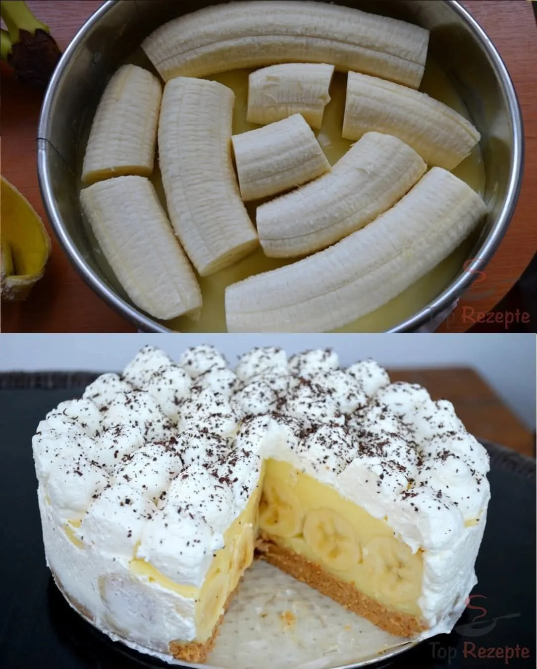 Podlogu za tortu namažite malo kreme od vanile, a zatim prelijte bananama. Sada po vrhu premažite preostalom kremom i stavite tortu u frižider.