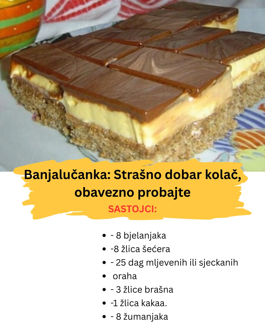 Bjelanjke ulupati u čvrst snijeg, dodati šećer i još dobro istući Kad je snijeg čvrst dodati mljevene orahe, brašno i kakao te lagano promiješati Peći u zagrijanoj pećnici na 200 C.