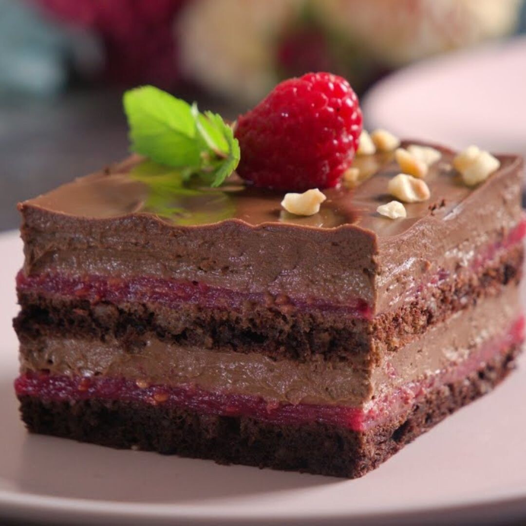 Na prvu koru stavite čokoladni fil, pa izravnajte. Na fil nanesite žele od malina. Stavite drugu koru i nežno pritisnite. Ostavite kolač da se ohladi i stegne pre nego što ga isečete na kocke.