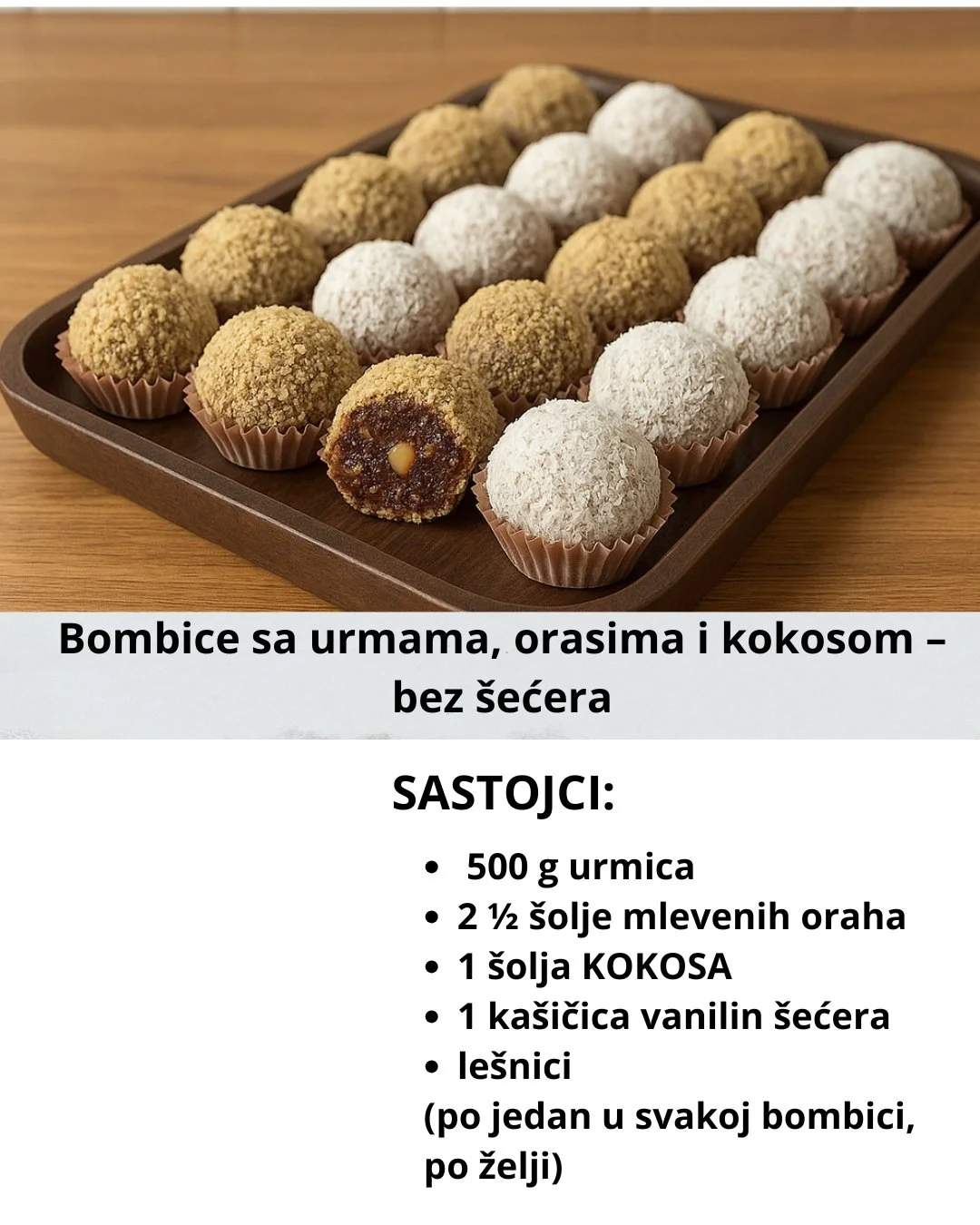Dobićete meke, mirisne i prirodno slatke bombice bez šećera. Urme daju savršenu prirodnu slast, pa nije potreban dodatni zaslađivač. Ove bombice su posne, zdrave i idealne kao užina, desert ili slatkiš za prazničnu trpezu.