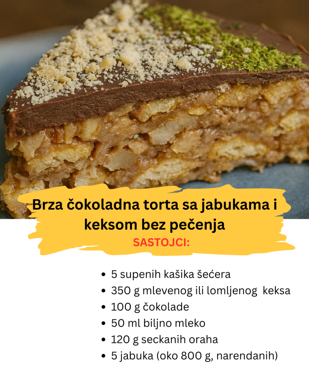 Ako vam je potrebna jednostavna i sigurna torta bez pečenja, ova cokoladna torta sa jabukama, orasima i keksom je pravi izbor. Pravi se lako, od dostupnih sastojaka, a rezultat je sočna, bogata torta sa osvežavajućom notom jabuka i punim čokoladnim ukusom.