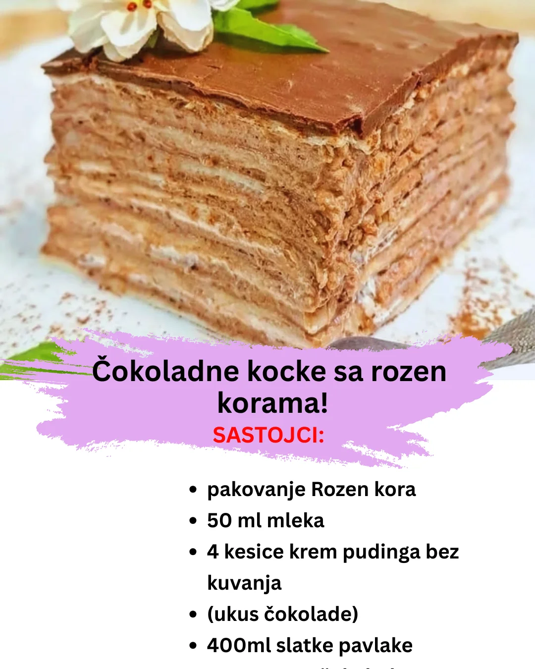 Ovaj čokoladni rozen kolač je idealan izbor kada želite brzu, jednostavnu i preukusnu poslasticu. Ne zahtijeva kuhanje, a rezultat je slojevita, kremasta i elegantna torta koja se savršeno uklapa u svaku priliku — od porodičnih okupljanja do svečanih slavlja.