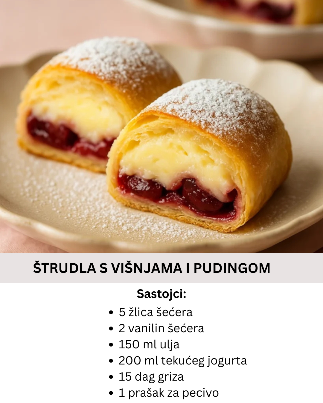 Priprema je i više nego jednostavna i oduzet će ti malo vremena. Kod ove savijače jedino moraš pripaziti da dobro ocijediš višnje iz kompota i da ti puding bude još vruć kada njime budeš premazivala kore.
