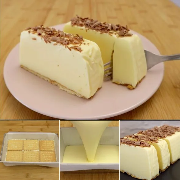 Sipajte smesu u posudu 12×20 cm obloženu pek papirom i stavite keks preko.