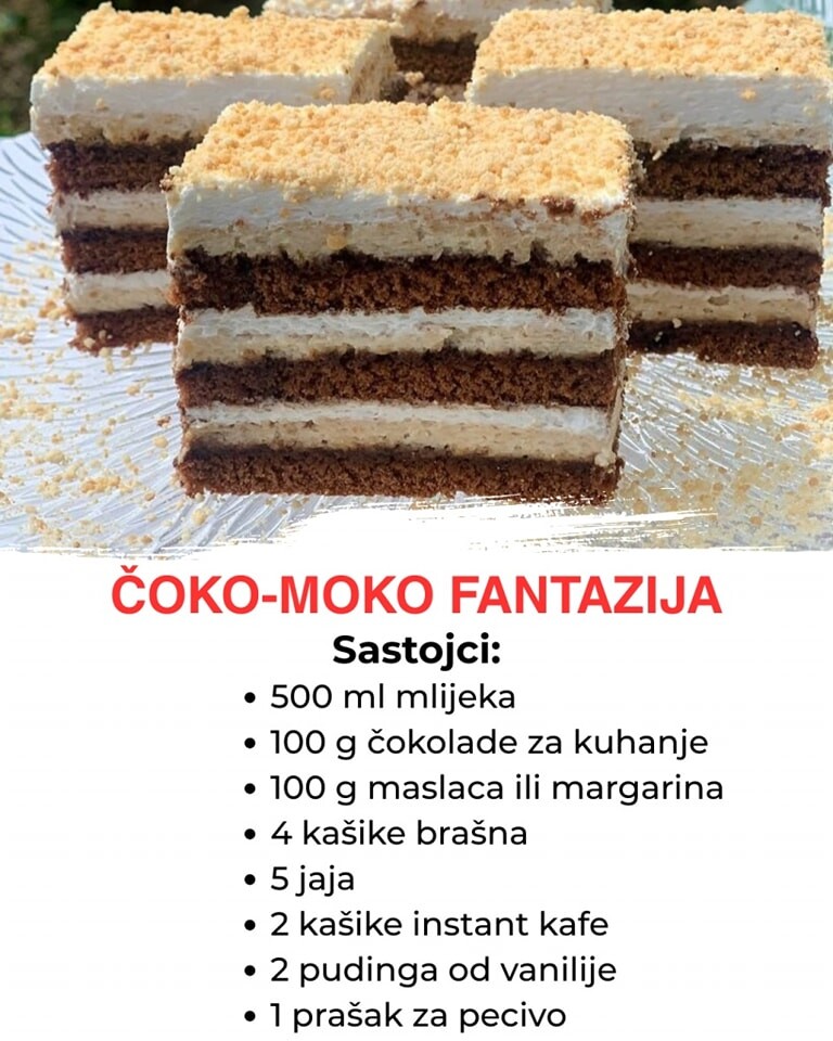 Čoko-Moko Fantazija je kolač koji osvaja na prvi zalogaj! Bogat čokoladni ukus uz suptilne note kafe čine ga savršenim izborom za sve ljubitelje sočnih i raskošnih poslastica. Priprema je jednostavna, a rezultat pravi spektakl za nepce.