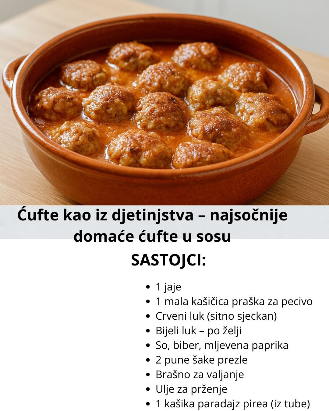 Ako tražite najbolji recept za domaće ćufte, one mekane, mirisne i sočne, baš kao što su ih nekada pravile naše mame i nane – onda ste na pravom mjestu. Ovo su ćufte kao iz djetinjstva, jednostavne za pripremu, pune ukusa i prave se od običnih sastojaka koje svi imamo kod kuće. Uvijek uspiju, a ukus će vas vratiti direktno u djetinjstvo i podsjetiti na toplinu domaće kuhinje. Recept je brz, praktičan i savršen za svaki dan – uz pire krompir, rižu ili domaće tijesto.