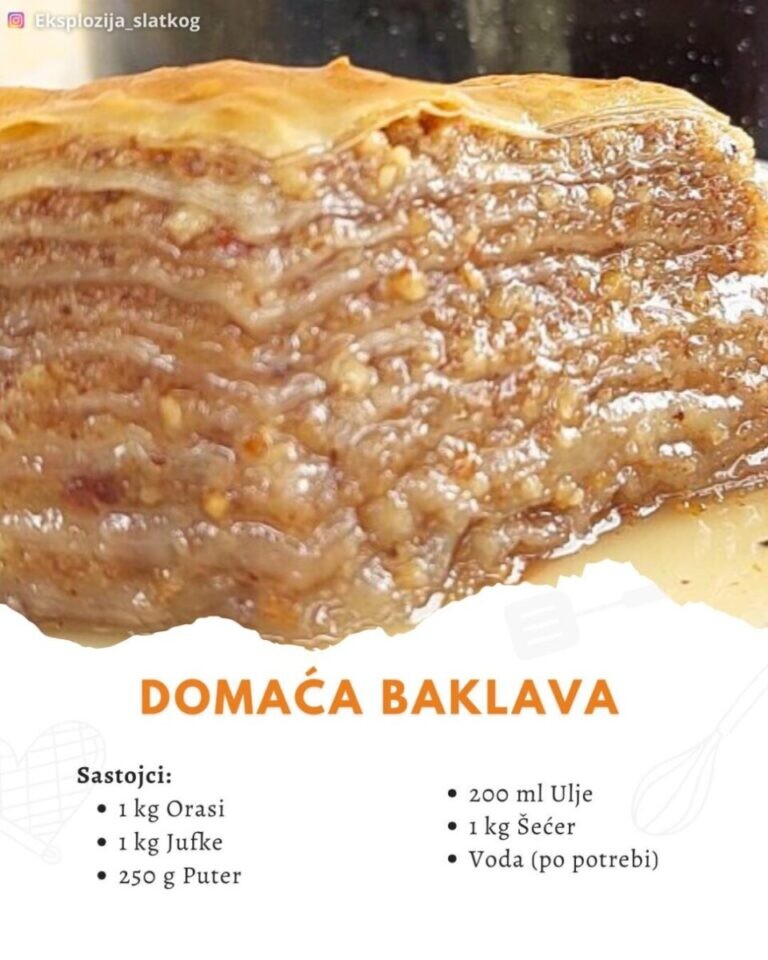Nijedan kolač ne miriše na dom i tradiciju kao baklava. Hrskave kore, bogat fil od oraha i mirisni sirup koji natapa svaki sloj čine je poslasticom kojoj niko ne može odoljeti. Idealna je i za praznike i za obične dane kada želite nešto posebno.