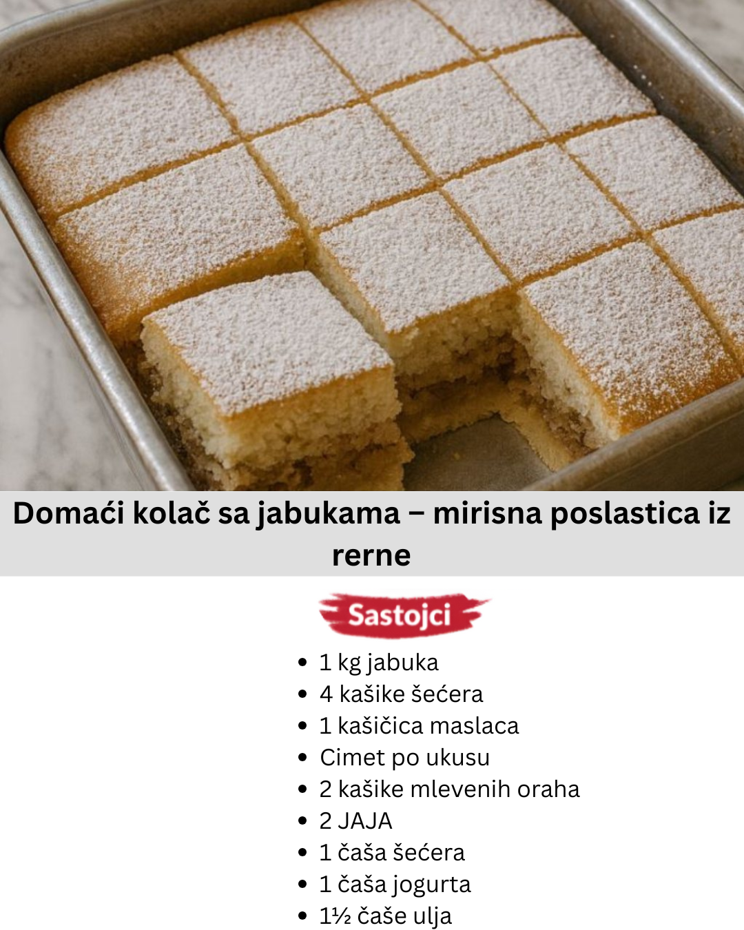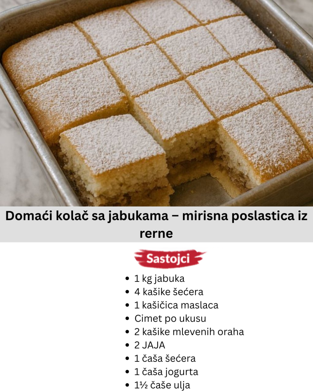 Ako voliš brze i jednostavne kolače sa jabukama, ovaj recept će te oduševiti! Miris cimeta, karamelizovanih jabuka i nežnog biskvita ispuniće kuću toplinom i podsetiti te na domaće kolače iz detinjstva.