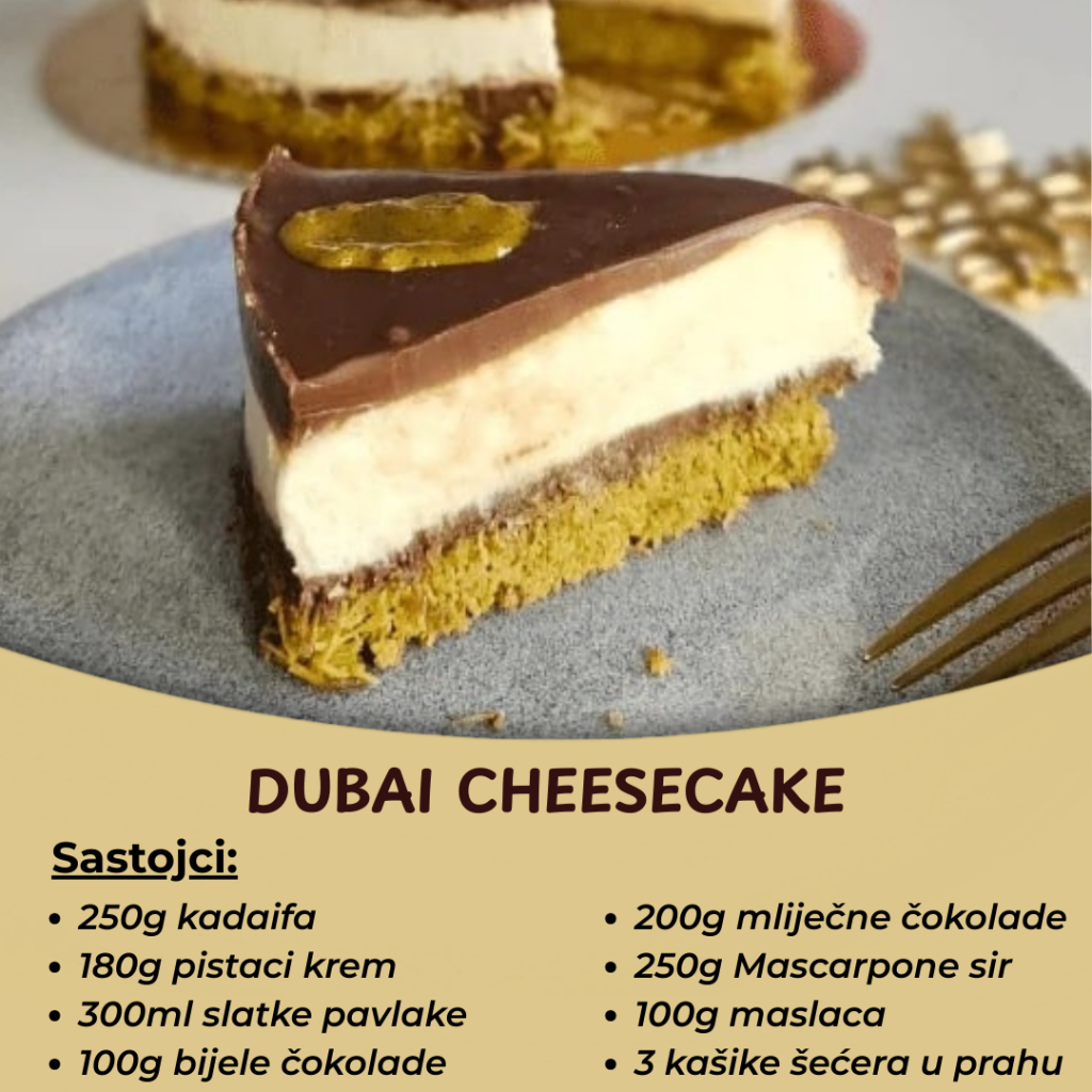 Dubai cheesecake je desert koji je osvojio svet i stekao popularnost u 2024. godini. Ovaj luksuzni kolač kombinuje hrskavu podlogu od kadaifa, bogat kremasti sloj sa pistacijama i topao čokoladni preljev, stvarajući savršen spoj ukusa i tekstura.
