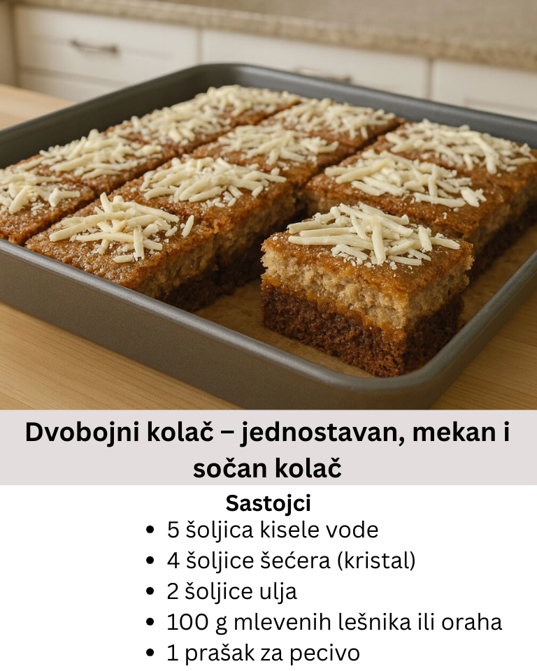 Ako volite brze i proverene domaće kolače, ovaj dvobojni kolač je savršen izbor! Priprema se bez jaja, samo od nekoliko sastojaka, a rezultat je neverovatno mekan, mirisan i ukusan kolač koji uvek uspe. Kombinacija dve boje – svetlog i tamnog dela sa kakaom, spojena marmeladom i posuta čokoladom, čini ga savršenim desertom uz kafu ili čaj.