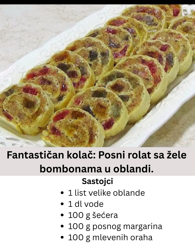 List oblande izvaditi iz vlažne krpe i premazati filom preko hrapave strane. Preko fila rasporediti iseckane žele bombone. Potom zaviti oblandu u rolat. Rolat ostaviti da se ohladi i stegne.