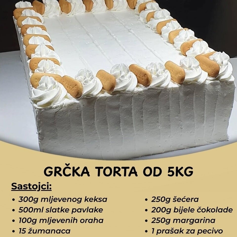 Ova raskošna torta idealna je za velika slavlja – rođendane, svadbe ili porodična okupljanja. Grčka torta oduševljava ne samo veličinom, već i bogatstvom ukusa: slojevi mekanih korica, kremasti fil sa žumancima i čokoladom, te završni sloj šlaga koji sve zaokružuje u savršen desert.