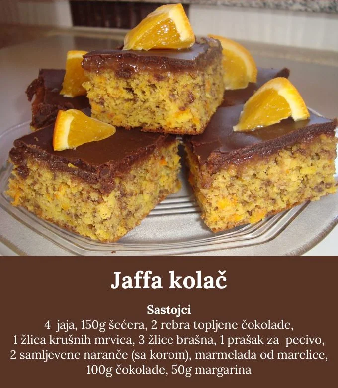 Jaja s šećerom izlupati, dodati rastopljenu čokoladu, samljevene naranče (sa korom!), krušne mrvice, brašno pomješano s praškom za pecivo. Istresti u posudu za pečenje i peći 20 min.