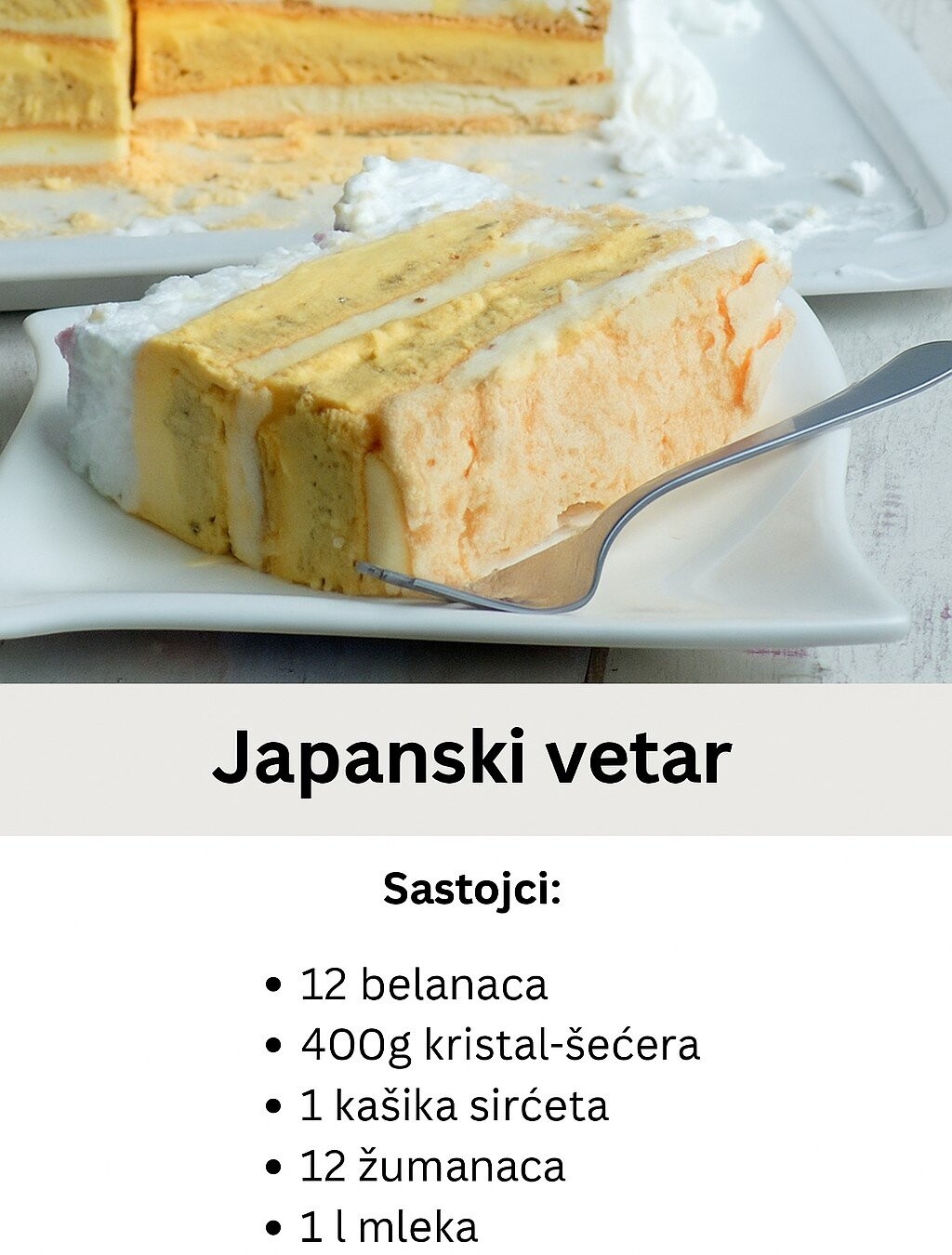 Japanski vetar je torta koja savršeno kombinuje laganu hrskavu koru, bogat i kremast fil i nežan sloj šlaga. Ovaj desert je jednostavan za pripremu, ali zahteva pažnju i preciznost kako bi svaki sloj bio savršeno pripremljen. Sa svojom bogatom teksturom i sofisticiranim ukusima, Japanski vetar je idealan za sve proslave, ali i za svakodnevne užitke.