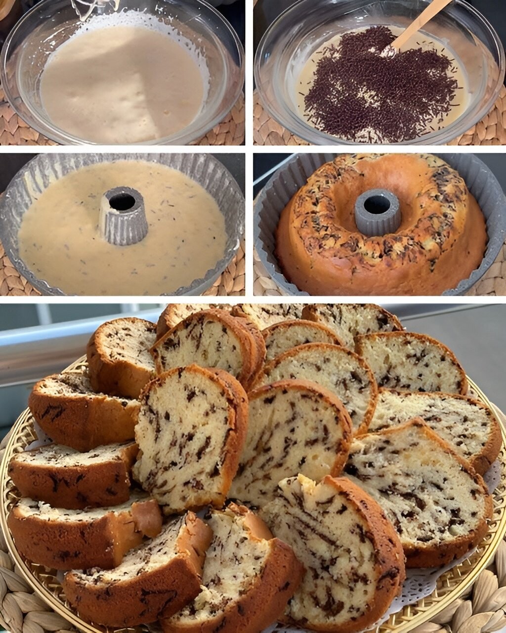 Dodamo brašno, vaniliju i prašak za pecivo i promiješamo. Na vrh dodamo čokoladu u granulama i nastavimo miksati.