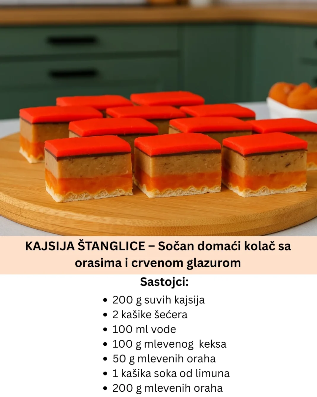 KAJSIJA ŠTANGLICE – SOČNI DOMAĆI KOLAČ SA ORASIMA I CRVENOM GLAZUROM