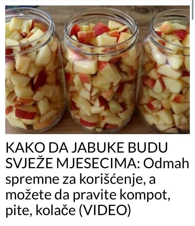 Brz i lak način da sačuvate jabuke svježe mjesecima, a da biće odlične kada želite ukusne kolače ili pite.Možda vam ne deluje pratkično da čuvate jabuke preko zime jer one uvijek mogu da se nađu na pijacama i u prodavnici, ali ovako je mnogo lakše. Kada se isekcaju, pošećere i preliju vodom one su spremne. Možete da ih koristite kada vam se jede kompot, pita sa jabukama, kolači… Nema čekanja da ih sjeckate ili da idete u radnju, samo uzmete koliko vam je potrebno.