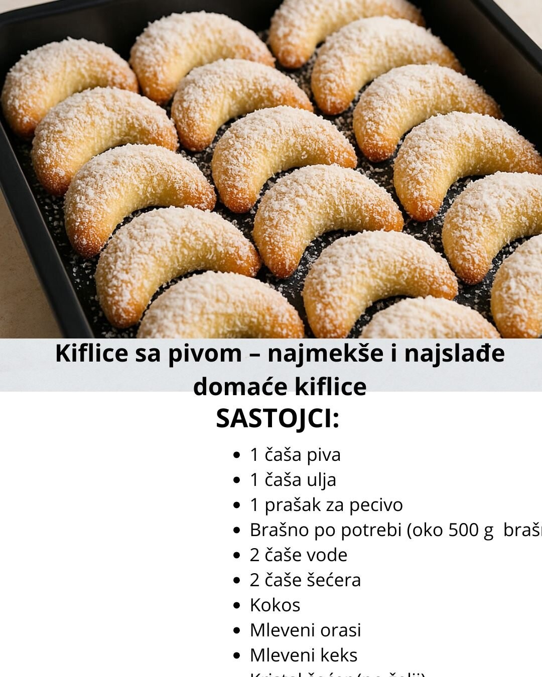 Ako tražite jednostavan, jeftin i ukusan recept za desert koji se topi u ustima, kiflice sa pivom su pravi izbor. Ove male slastice prave se od samo nekoliko sastojaka, bez dugog čekanja i komplikacija, a rezultat su mekane i sočne kiflice koje možete valjati u kokos, orahe, mleveni keks ili sitni šećer – u zavisnosti od ukusa. Idealne su uz šoljicu kafe ili kao slatko posluženje za goste.