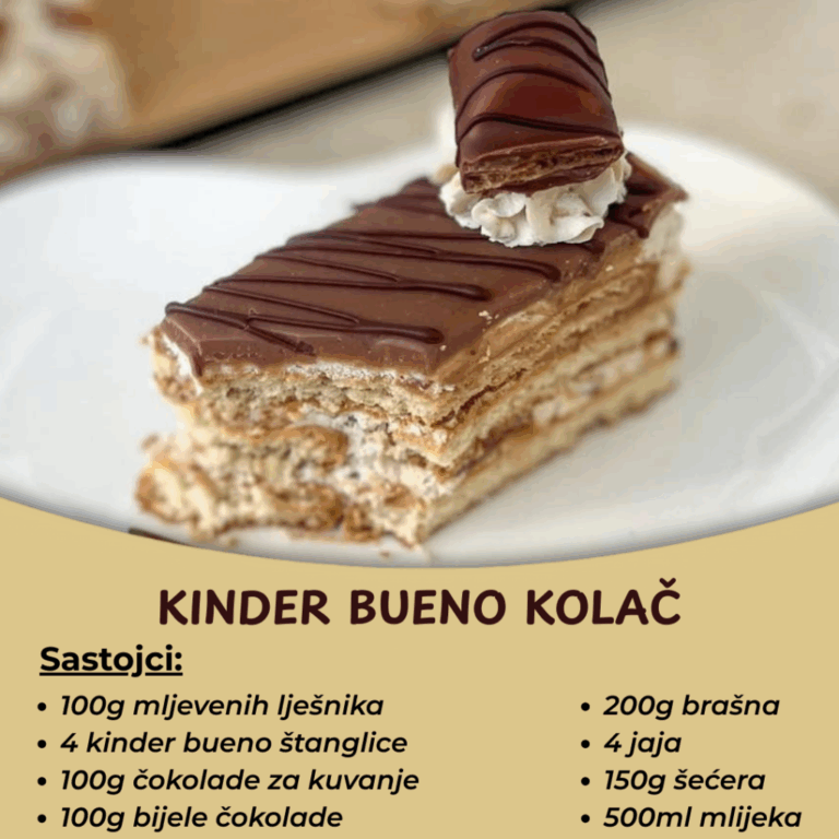 Preliv – Otopite čokoladu sa uljem i prelijte kolač. Dekorišite Kinder Bueno komadićima ili po svom ukusu.