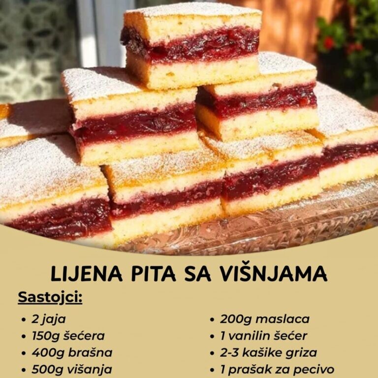 Savršen domaći kolač koji se brzo priprema, a ukusom vraća u djetinjstvo! Kombinacija mekanog prhkog tijesta i sočnog fila od višanja čini ovu pitu nezaobilaznom u svakoj sezoni.