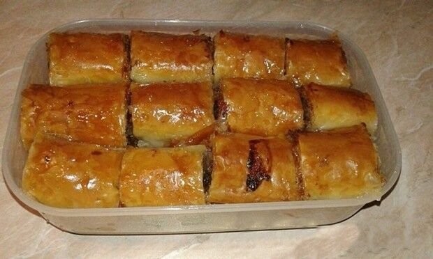 – 18 tankih kora za baklavu– 4 jaja– 4 kasike secera– 4 kasike griza– 3 kasike brasna– 1 prasak za pecivo– 150 gr sjeckanih oraha– 100 gr grozdjica– 2 kisele jabuke– 3 dcl ulja.
