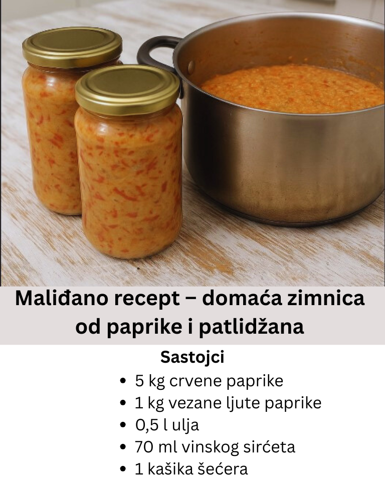 Maliđano je jedna od najlepših domaćih zimnica koja dolazi sa juga Srbije i pravi se od pečene paprike, plavog paradajza i ljutih vezanih paprika. Ovaj namaz je pun ukusa, lagano pikantan i savršen kao prilog uz hleb, meso ili kao deo bogate trpeze tokom zime. Ako volite ajvar, sviđaće vam se i maliđano jer mu daje posebnu aromu zahvaljujući ljutim paprikama.