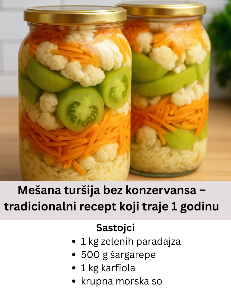 Ako voliš domaću zimnicu bez veštačkih dodataka, onda je ovaj recept pravi izbor. Mešana turšija bez konzervansa je stari tradicionalni način pripreme povrća, uz koji turšija ostaje hrskava i puna ukusa do čak 12 meseci. Savršena je za zimu i odličan način da sačuvaš prirodne vitamine iz povrća tokom cele godine.