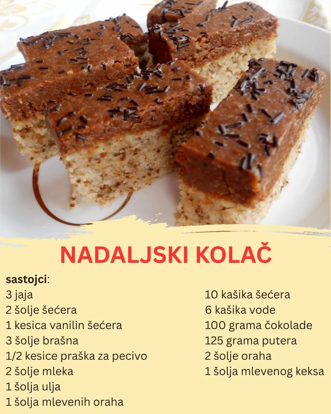 Deserti koji kombinuju jednostavnost pripreme i bogatstvo ukusa uvek su najpoželjniji, bilo da se pripremaju za prazničnu trpezu ili kao brz i ukusan zalogaj za svakodnevnu užinu. Jedan takav recept je Nadaljski kolac , poslastica koja ujedinjuje sočne slojeve, bogat čokoladni nadev i aromatične orašaste plodove, što ga čini savršenim desertom za sve prilike.