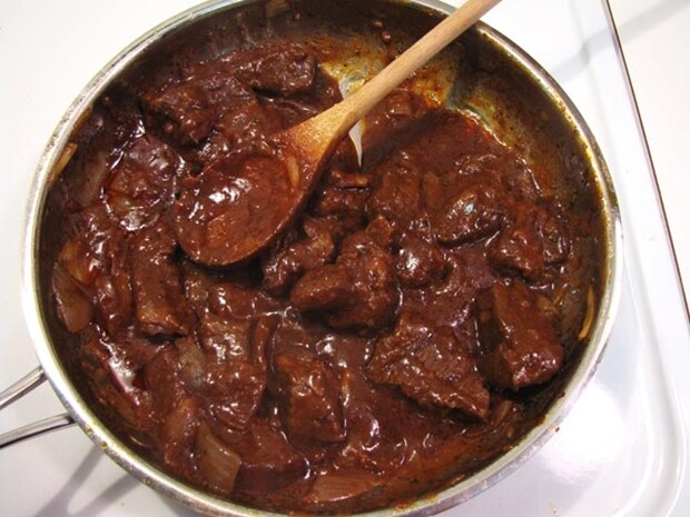 Govedinu izrežite na kockice pa uvaljajte u brašno i popržite na ulju dok ne porumeni. Izvadite iz šerpe pa u njoj izdinstajte krupno sjeckani luk i bijeli luk dok ne omekša. Vratite meso i podlijte sa vodom i paradajz pireom. Kuhajte na laganoj vatri oko 1 h.