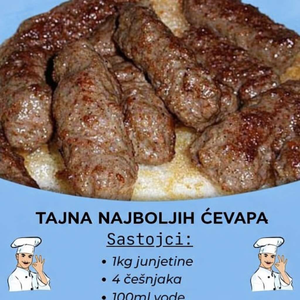 Sve što vam je potrebno za prave ćevape je 1,5 kg mljevene junetine, ½ kg janjetine, 4-5 češnja bijelog luka, 2% od ukupne količine mesa, soli i 2 kašičice sode bikarbone.