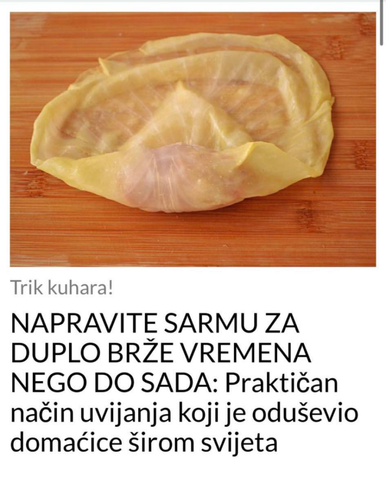 Sarma je tradicionalno jelo, koje se uglavnom pravi od kiselog kupusa, mljevenog mesa i pirinča tako što se meso i pirinač uviju u jedan list kupusa. U pojedinim krajevima Srbije sarma se uvija u lišće vinove loze, a nadev se pravi od pirinča proprženog na luku. Na ovakav način se spremaju za vrijeme posta. Sarma je često jelo na srpskim svetkovinama i veseljima. Isprobajte još brži i praktičniji način uvijanja uz pomoć šolje.