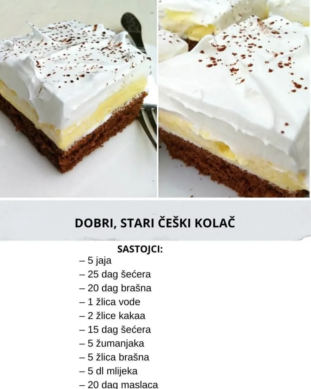 Ovaj stari češki kolač je jedan od onih recepata koji osvajaju na prvi zalogaj. Mirisom podsjeća na dom i djetinjstvo, a ukusom nadmašuje mnoge moderne kolače. Mekano tijesto, nježan fil od vanile i blaga nota limuna čine ga savršenim desertom uz kafu, čaj ili nedjeljni ručak. Priprema je jednostavna, sastojci su pristupačni, a rezultat savršen – baš onakav kakav su pravile bake.