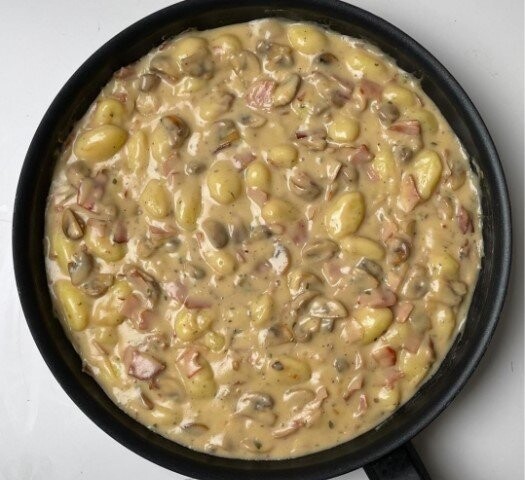 U ključali umak sada pažljivo dodajte 500 g svežih njoka. One se kuvaju direktno u sosu, što je trik koji daje poseban rezultat. Dok se lagano krčkaju, njoke upijaju sve arome – slanost šunke, zemljasti miris gljiva i kremastost mleka. Ako primetite da je umak previše gust, dodajte još malo mleka ili vode.