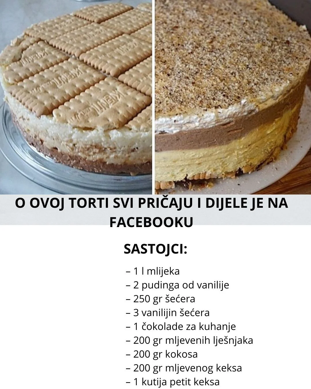 Puding razmutiti s malo mlijeka, a preostalo mlijeko staviti sa šećerom da prokuha pa mu dodati razmućeni puding. Kuhati dok se ne zgusne. Kad se fil ohladi dodati mu vanilijin šećer i margarin, pa podijeliti smjesu na 3 jednaka dijela. U prvi dio dodati istopljenu čokoladu i lješnjake, u drugi kokos, a u treći mljeveni keks. Slagati red keksa- fil sa čokoladom i lješnjacima, red keksa- fil sa keksom, red keksa- fil sa kokosom, red keksa- šlag (cijeli tortu ukrasiti).