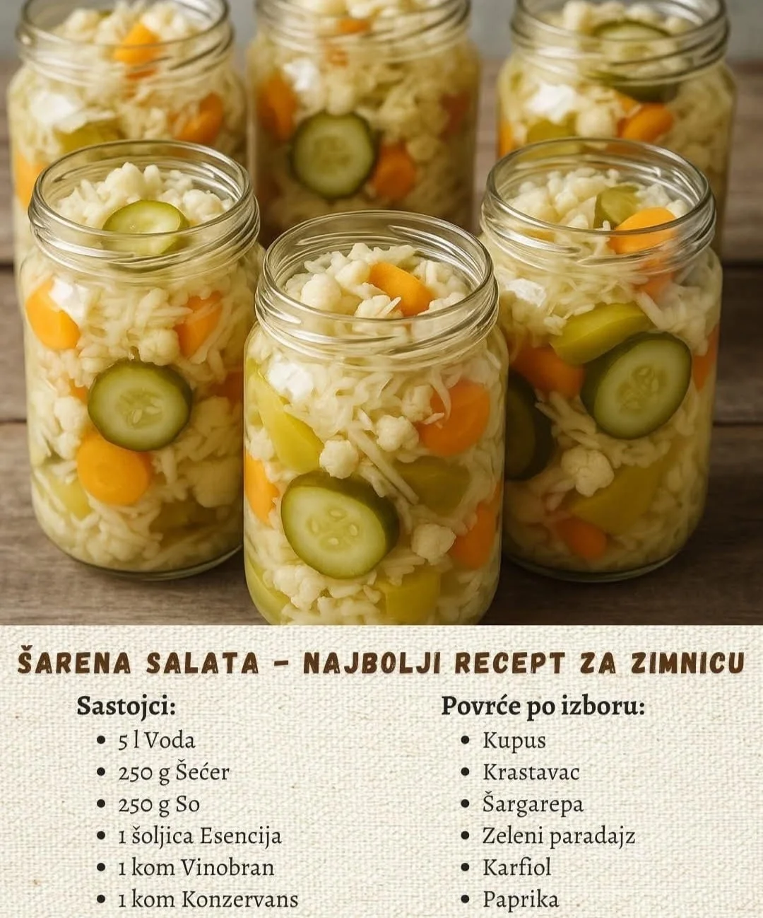 Ovo je recept za šarenu salatu, popularnu zimnicu. Recept je preuzet s priložene slike i prilagođen u tekstualni format radi lakšeg korištenja.