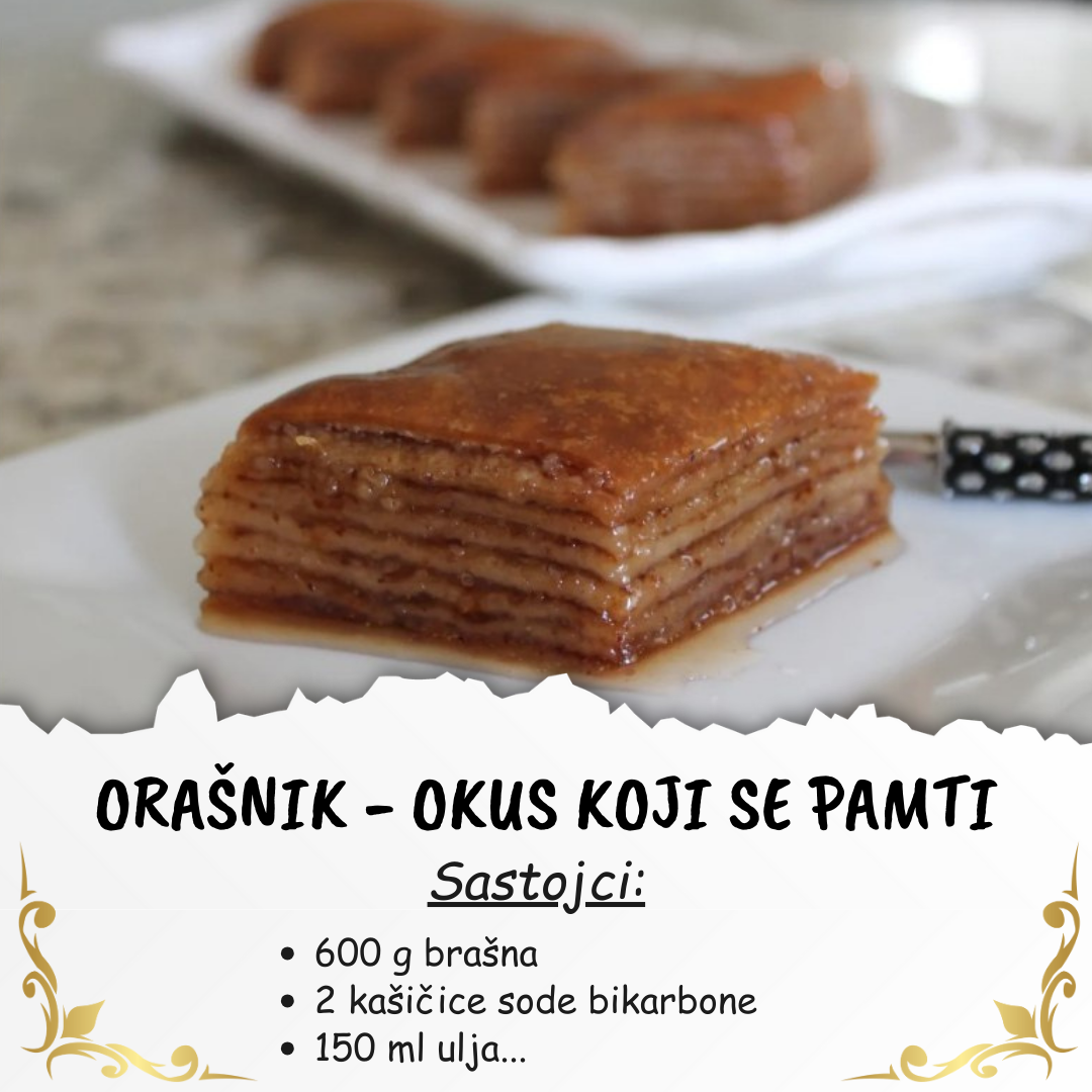 Orašnik je tradicionalna poslastica koja se prepoznaje po bogatom ukusu oraha i hrskavoj teksturi, a sirup koji upija daje mu posebnu sočnost. Savršen je za sve prilike kada želite uživati u jednostavnom, a izuzetno ukusnom desertu.