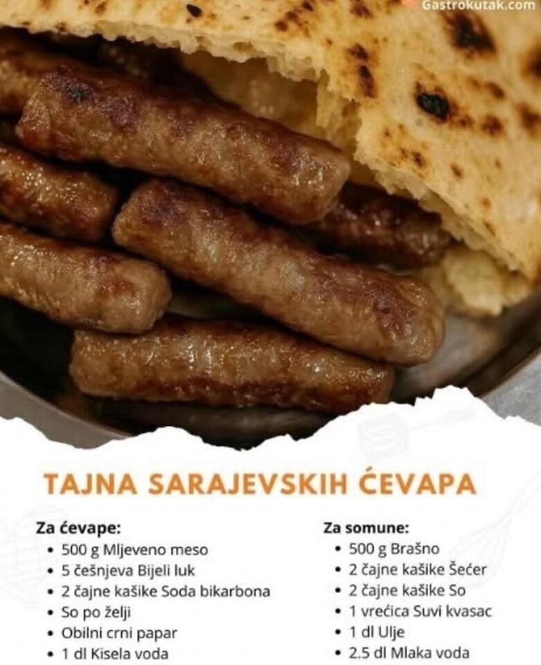 Sve što vam je potrebno za prave ćevape je 1,5 kg mljevene junetine, ½ kg janjetine, 4-5 češnja bijelog luka, 2% od ukupne količine mesa, soli i 2 kašičice sode bikarbone.