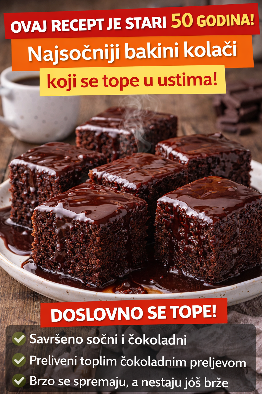 Kada je kolač gotov i još topao, polako ga prelijte čokoladnim preljevom. Upravo tu dolazi tajna – kolač upija preljev i postaje nevjerovatno sočan.