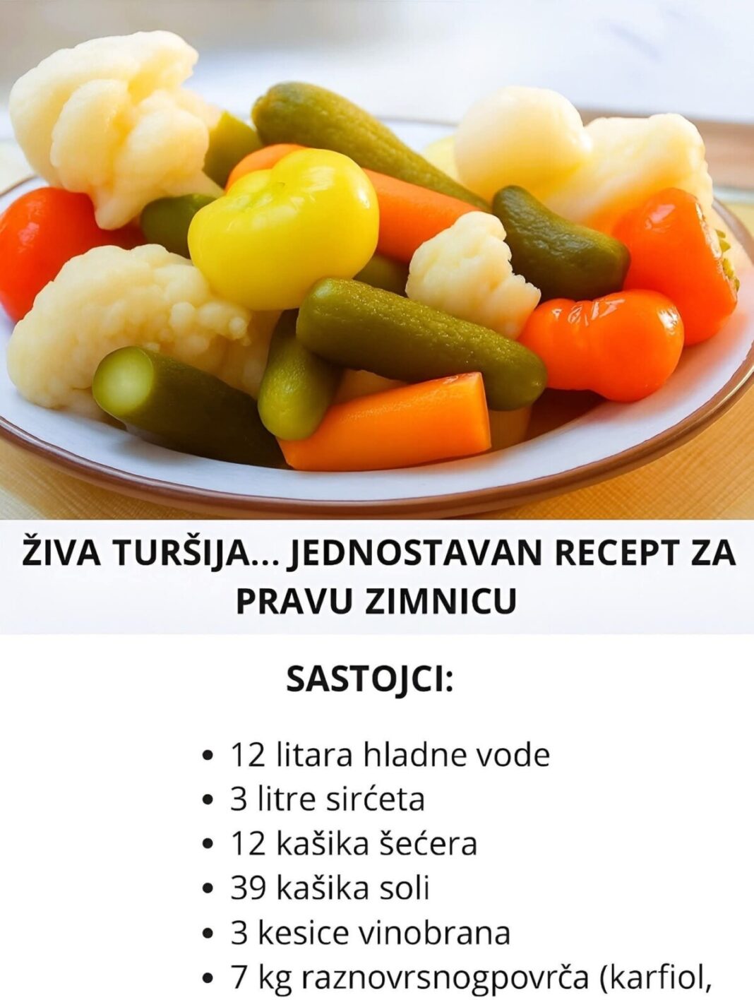 5 kg povrća za turšiju: krastavčići, paprika (šilja ili somborka), šargarepa, zeleni paradajz, karfiol, sitni crni luk