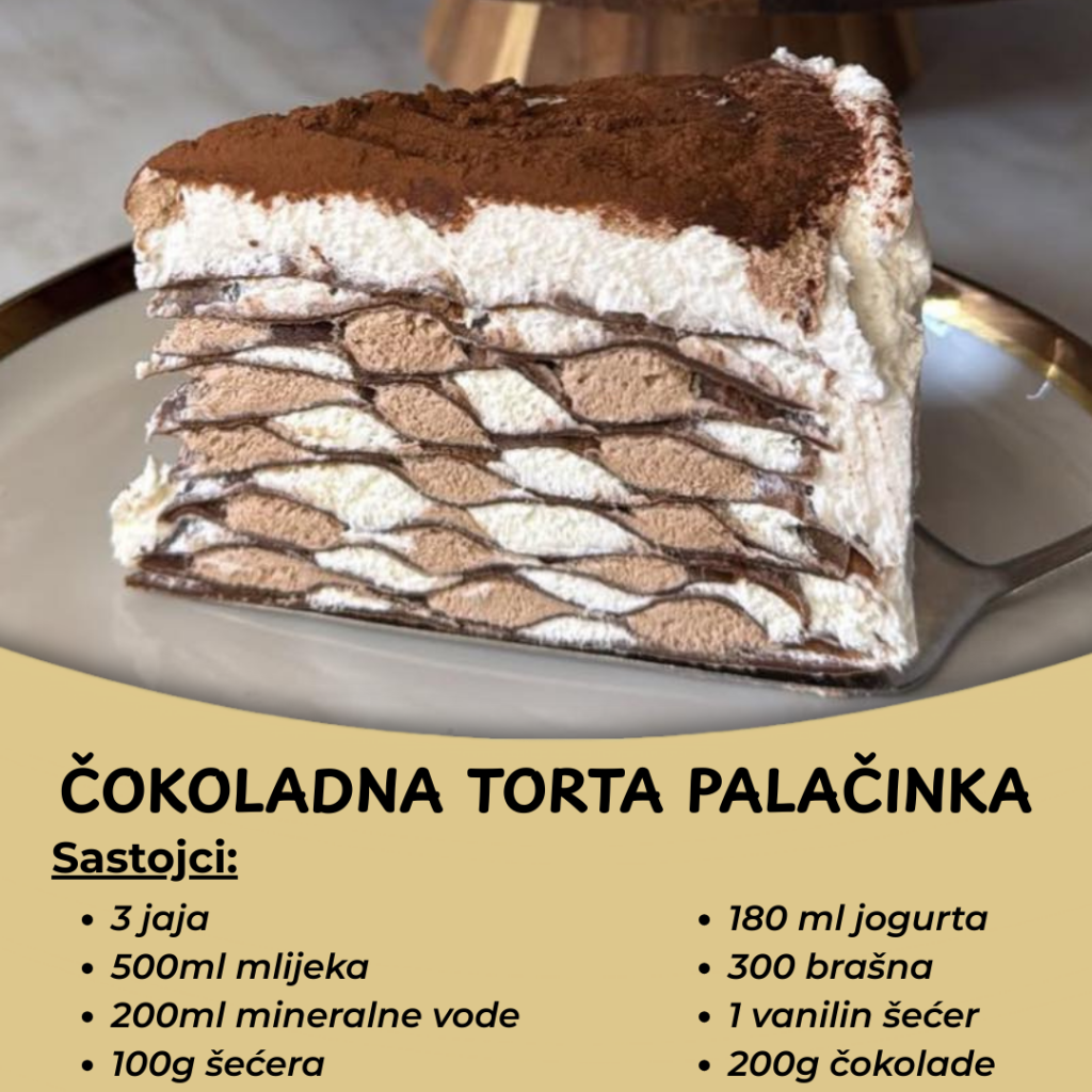 Prvo pripremite smjesu za palačinke: Umutite jaja sa šećerom i solju, zatim dodajte mlijeko i mineralnu vodu. Postepeno dodajte brašno i kakao, dobro umutite dok ne dobijete glatku smjesu bez grudvica.