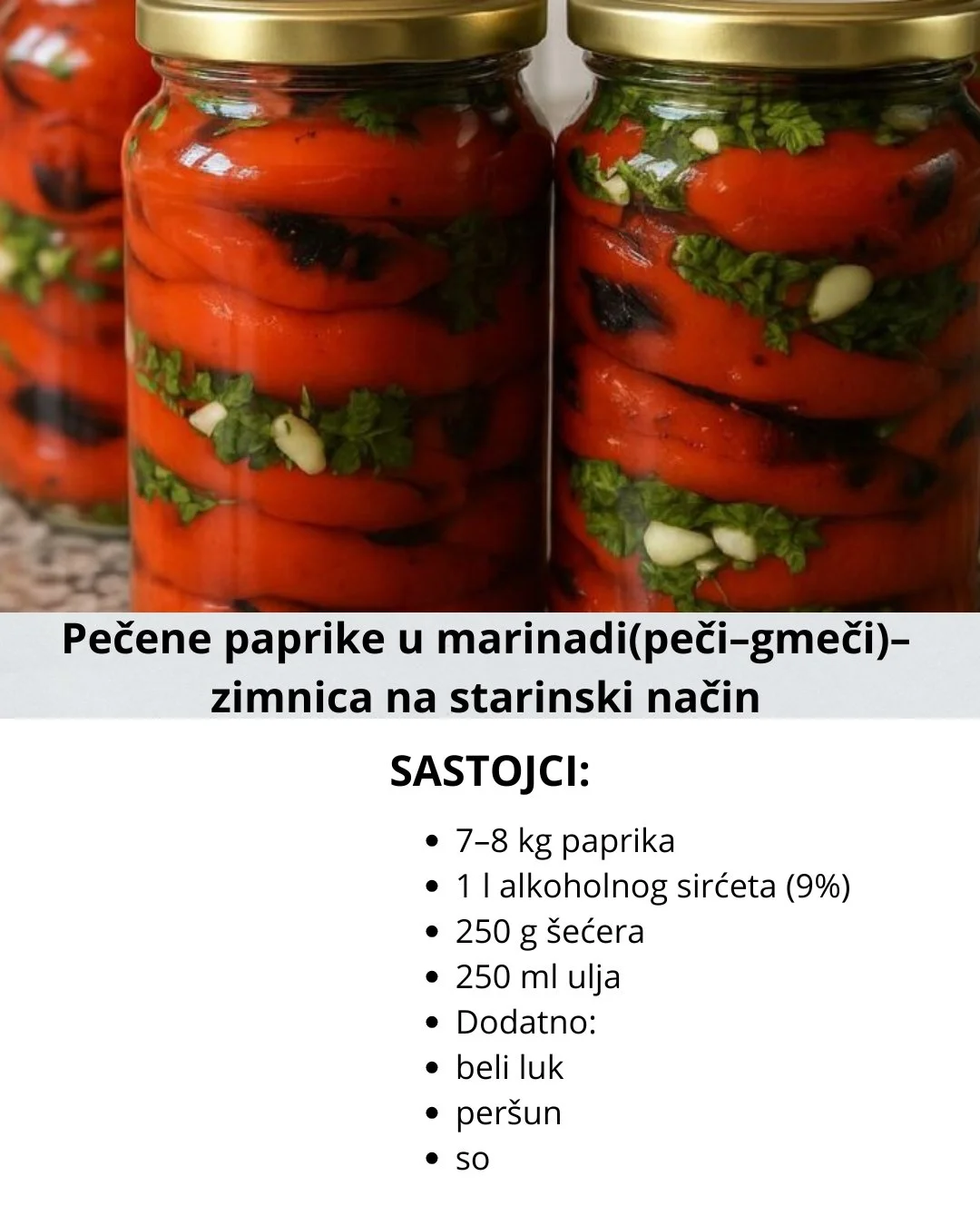 Ako tražite recept za domaće paprike za zimnicu, onda je ovaj stari i provereni način spremanja Pečene paprike u marinadi (peči – gmeči) pravi izbor. Paprike spremljene na ovaj način su sočne, aromatične i odlične kao prilog uz gotovo svako jelo. Recept je jednostavan, a ukus neodoljiv – baš onakav kakav pamtimo iz kuhinja naših baka.