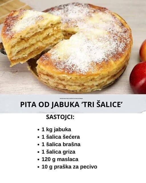 Pita od jabuka “tri kašike” je jedan od onih kolača koji se prave brzo, a nestaju još brže. Idealna je kad želite nešto slatko, domaće i bez komplikacija.