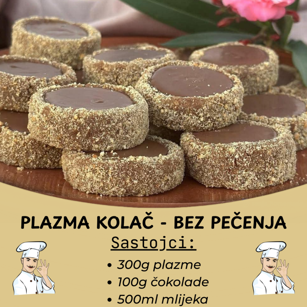 Zagrej mleko i u njemu otopi puter, šećer u prahu i vanilin šećer. Kada se sve lepo sjedini, skloni s vatre i umešaj mlevenu Plazmu i orahe ili lešnike ako koristiš.