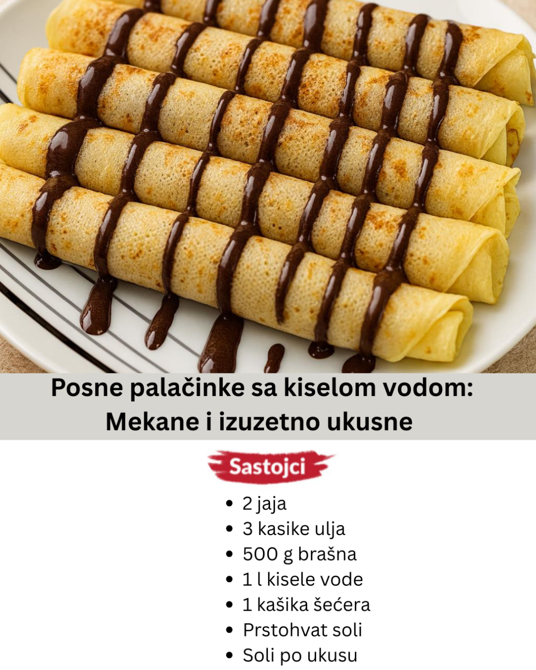 Priprema: U kiselu vodu dodati prstohvat soli i šećer. Postepeno dodavati brašno i mutiti. U tiganj staviti vrlo malo margarina i zagrejati ga. Sipati smesu i pržiti palačinke. Palačinke filovati džemom, a može da se doda i posni mleveni keks.