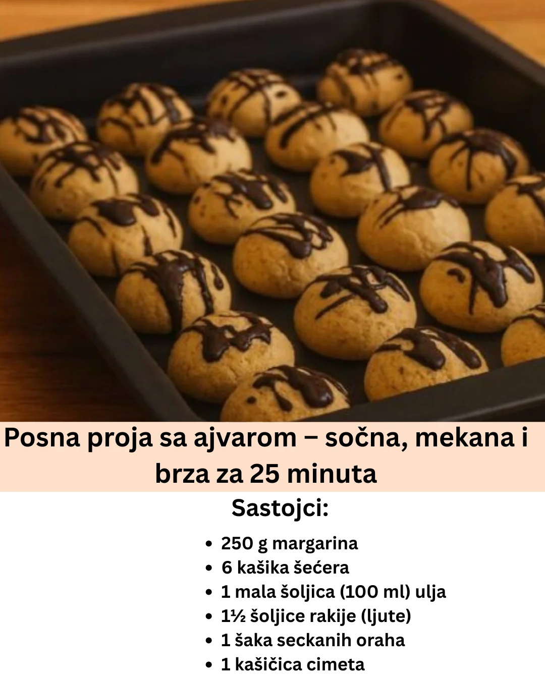 Njihova posebnost je u tome što se prave sa margarinom uljem, orasima i mirisnim cimetom, a na kraju se dekorišu otopljenom čokoladom. Ukus je bogat, a testo mekano i nežno – pravi dokaz da i posni kolaci mogu biti savršeno ukusni!