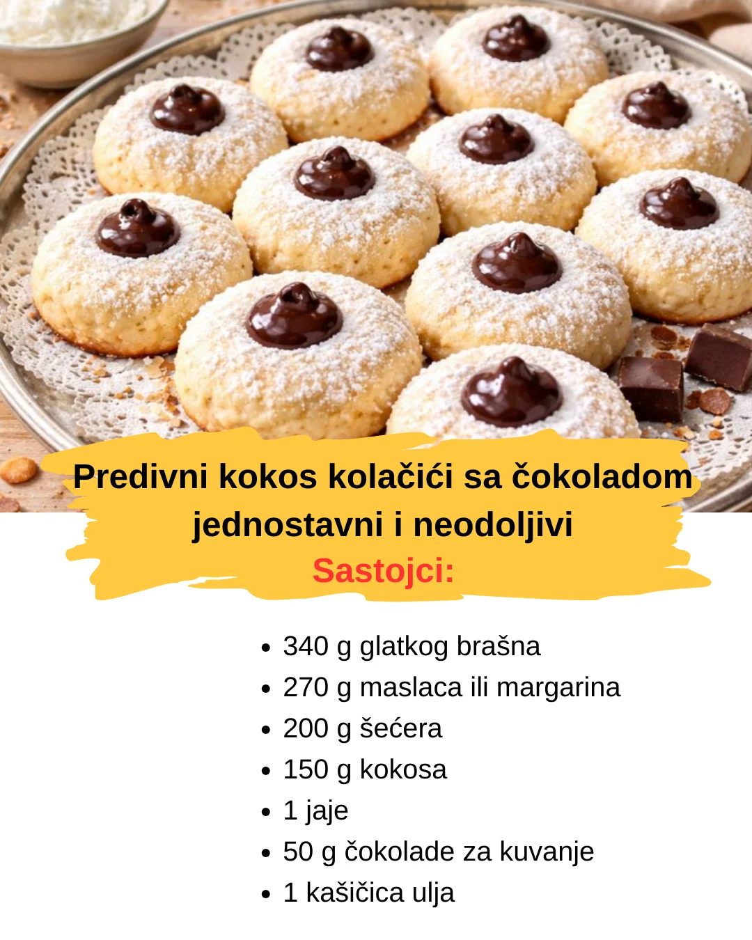 Kokos kolačići sa čokoladom su savršen izbor kada želite brz, jednostavan i siguran recept za sitne kolače koji se tope u ustima. Kombinacija kokosa, maslaca i čokolade daje pun, bogat ukus, dok je priprema laka i pogodna i za početnike. Idealni su za praznike, slave ili uz popodnevnu kafu.