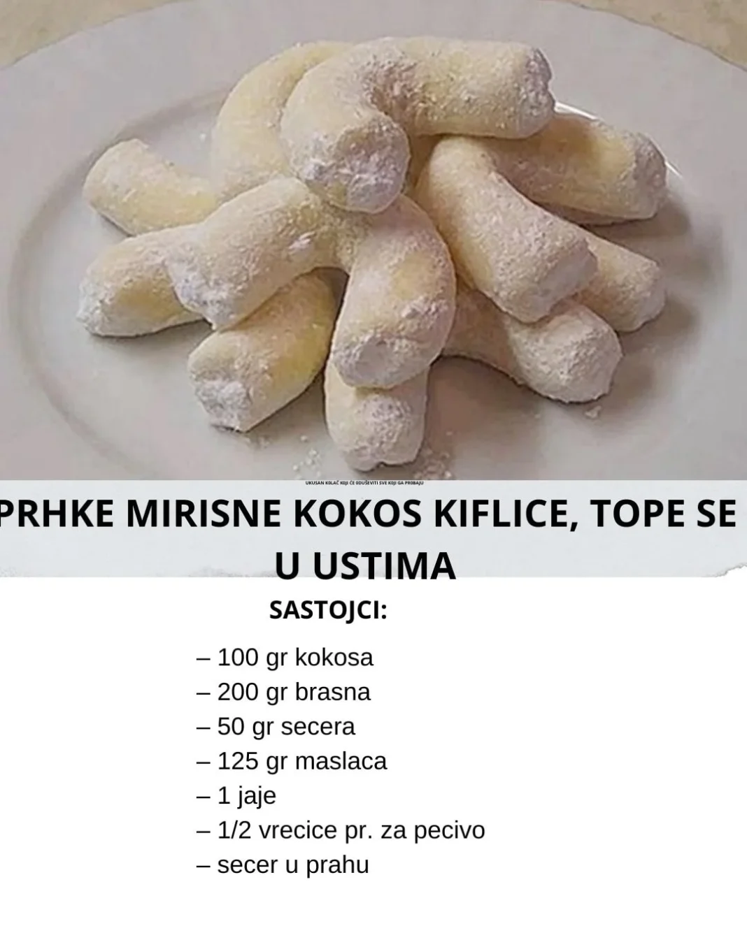 U brasno dodajte kokosovo brasno, maslac narezan na listice jaje, secer i pr. za pecivo. Napravite glatko tijesto i od njega pravite kiflice. Slazite ih na pleh za pecenje oblozen pekpapirom.