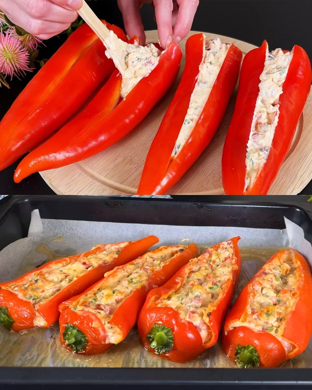 Poslaži polovine paprika u blago nauljenu vatrostalnu posudu, otvorene strane prema gore.