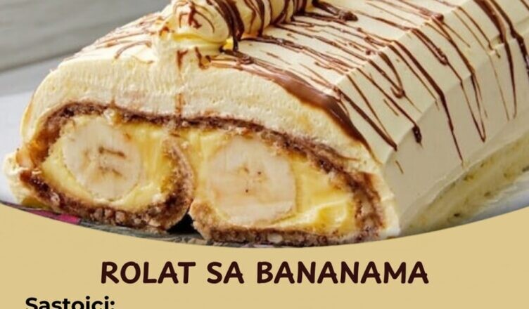 Odrolaj biskvit, premaži ga kremom i poređaj cijele banane duž jedne strane. Pažljivo zarolaj.