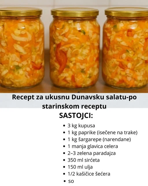 Ova Dunavska salata je pravi klasik domaće kuhinje! Priprema se po receptu naših baka — jednostavno, zdravo i bez konzervansa. Odlično se slaže uz sva jela, naročito tokom zime, kada svojom aromom i svežinom vraća mirise leta.